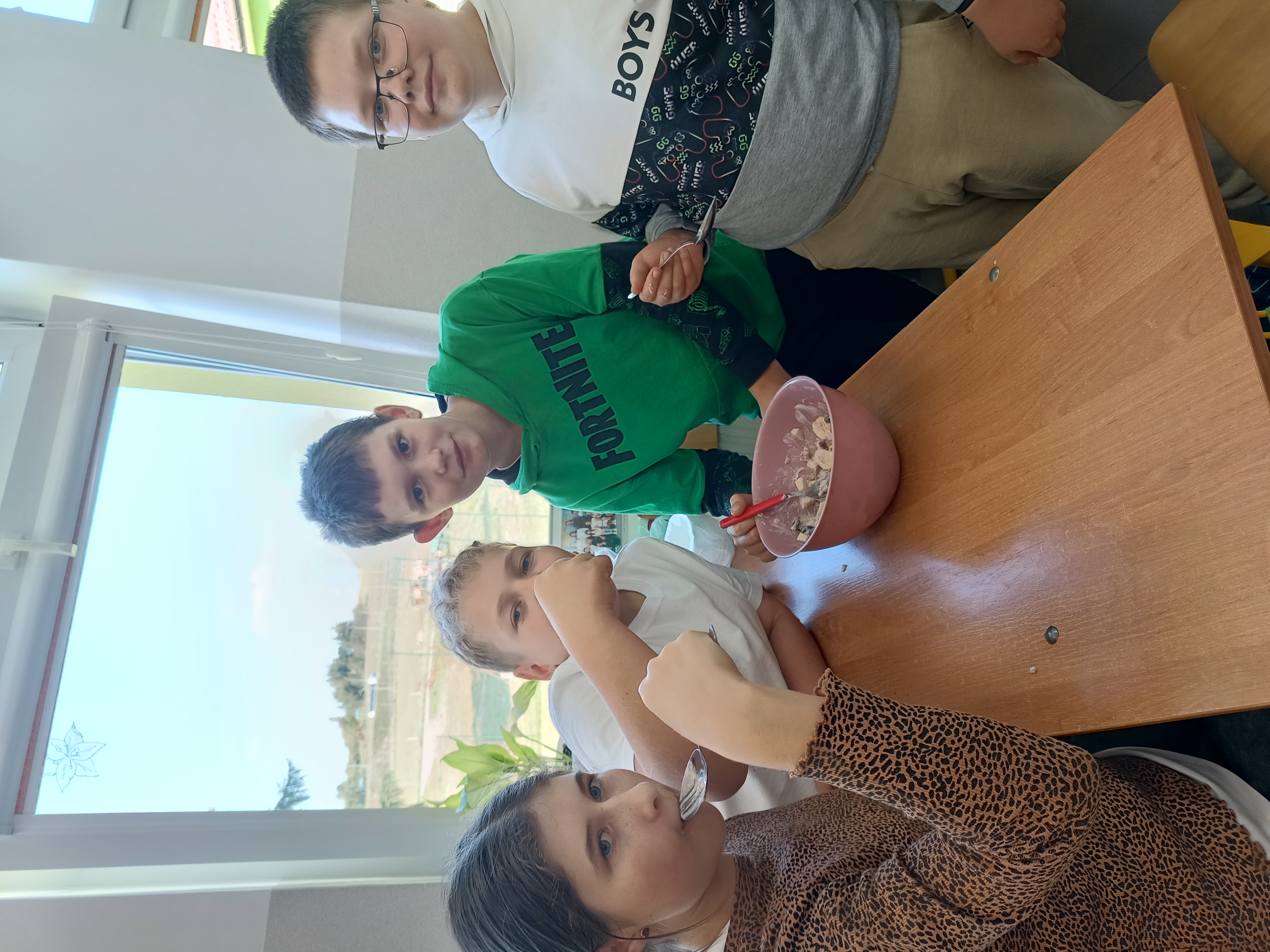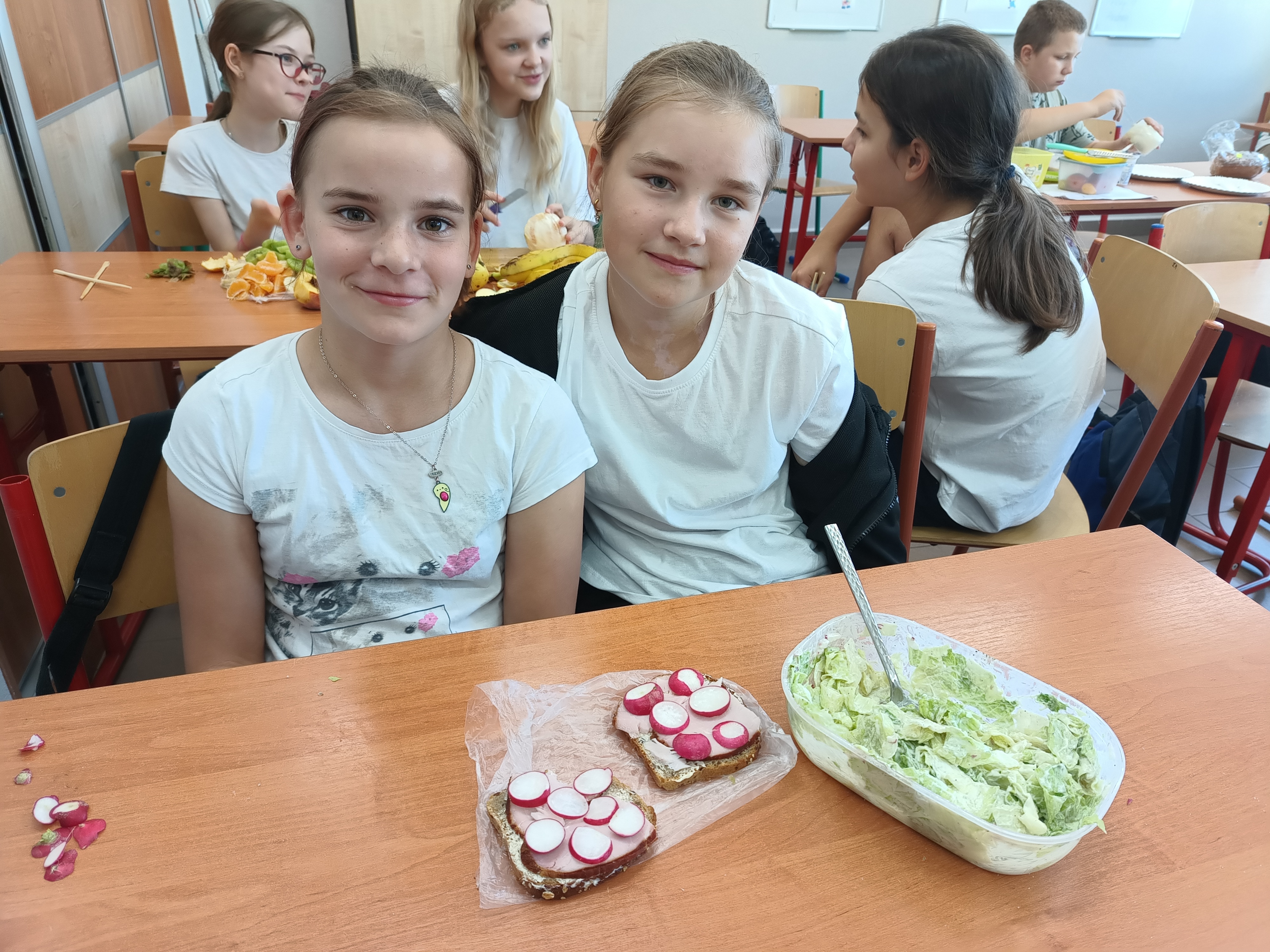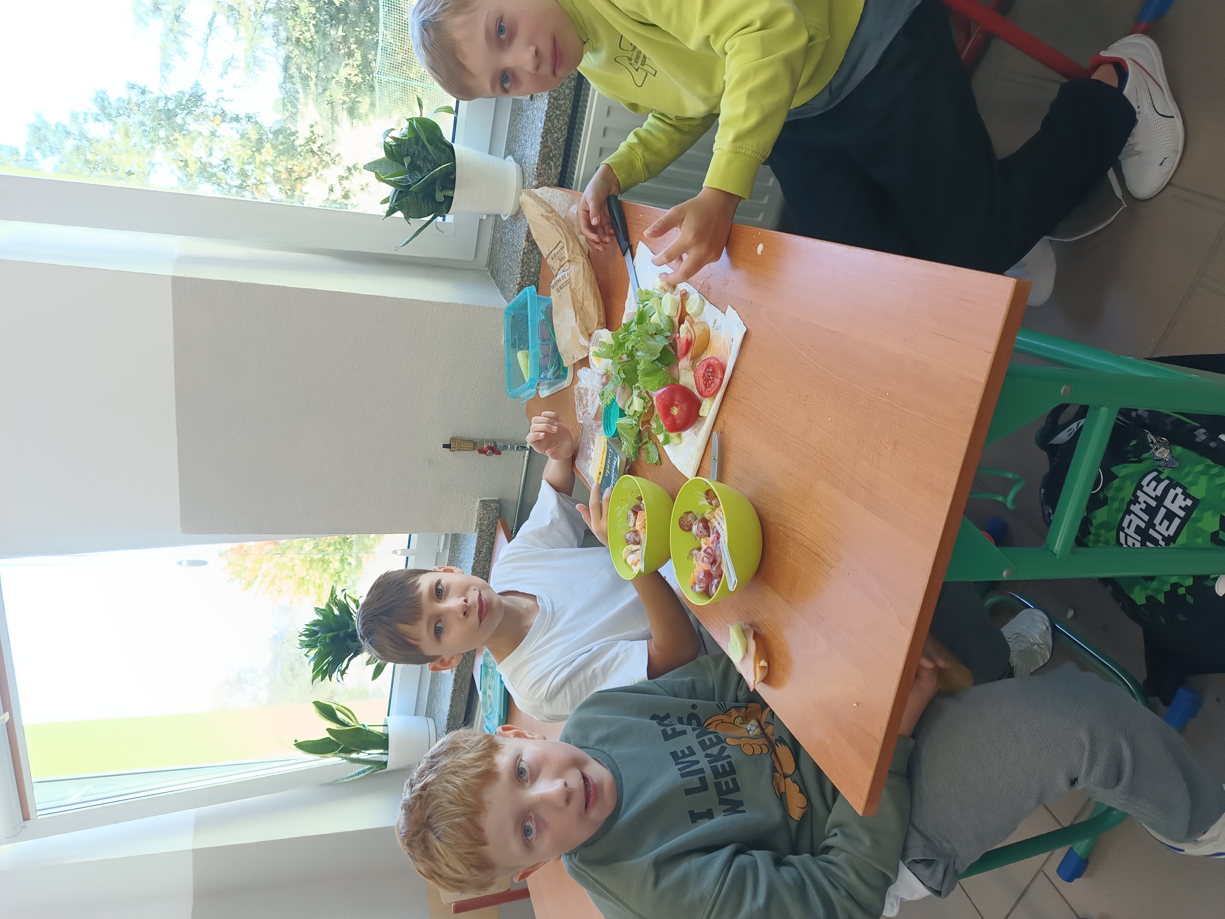 Uczniowie samodzielnie przygotowali zdrowe posiłki lub przekąski, te które dobrze im smakują. Natalia z Wiktorią przyrządziły sałatkę warzywną i kanapki. Lena, Maja i Zuzia owocowe szaszłyki. Mikołaj i Filip P. jaja z pomidorami w sosie czosnkowym, Jakub sałatkę owocową. Kuba B., z Wojtkiem i Andrzejem wykonali sałatkę owocową oraz zdrowe kanapeczki. Natomiast Filip, Ola, Eryk i Marek wykonali sałatkę owocową.