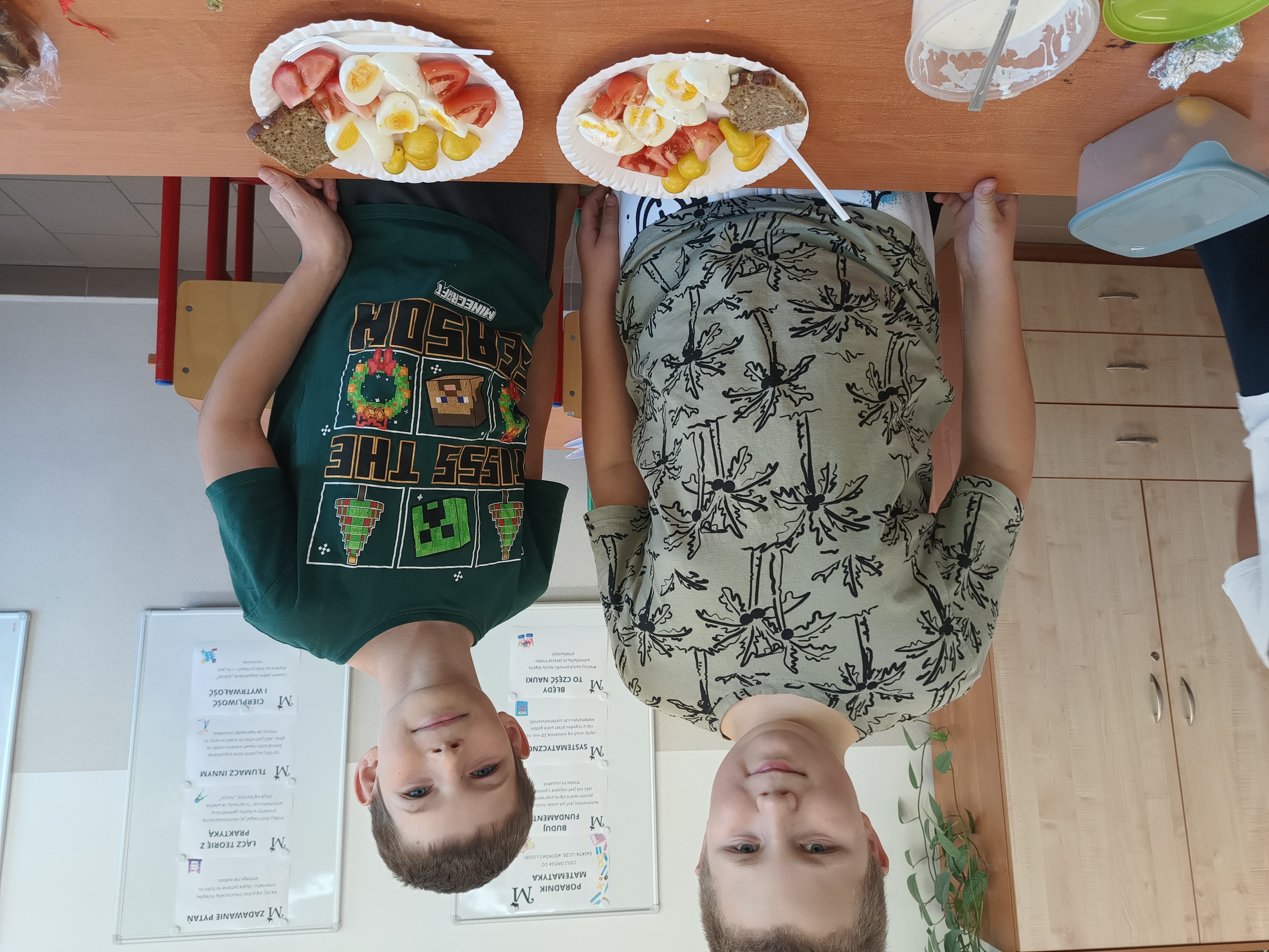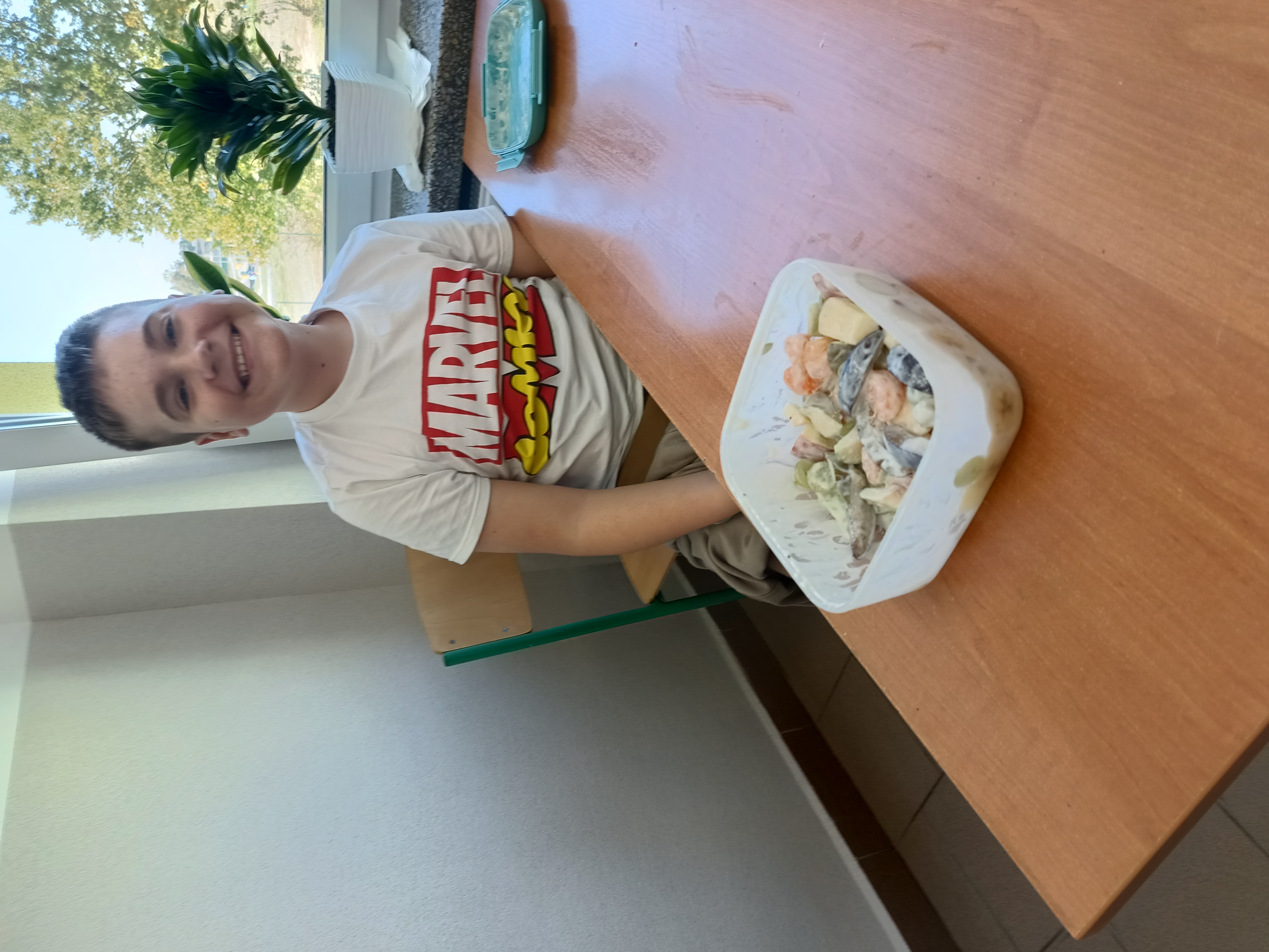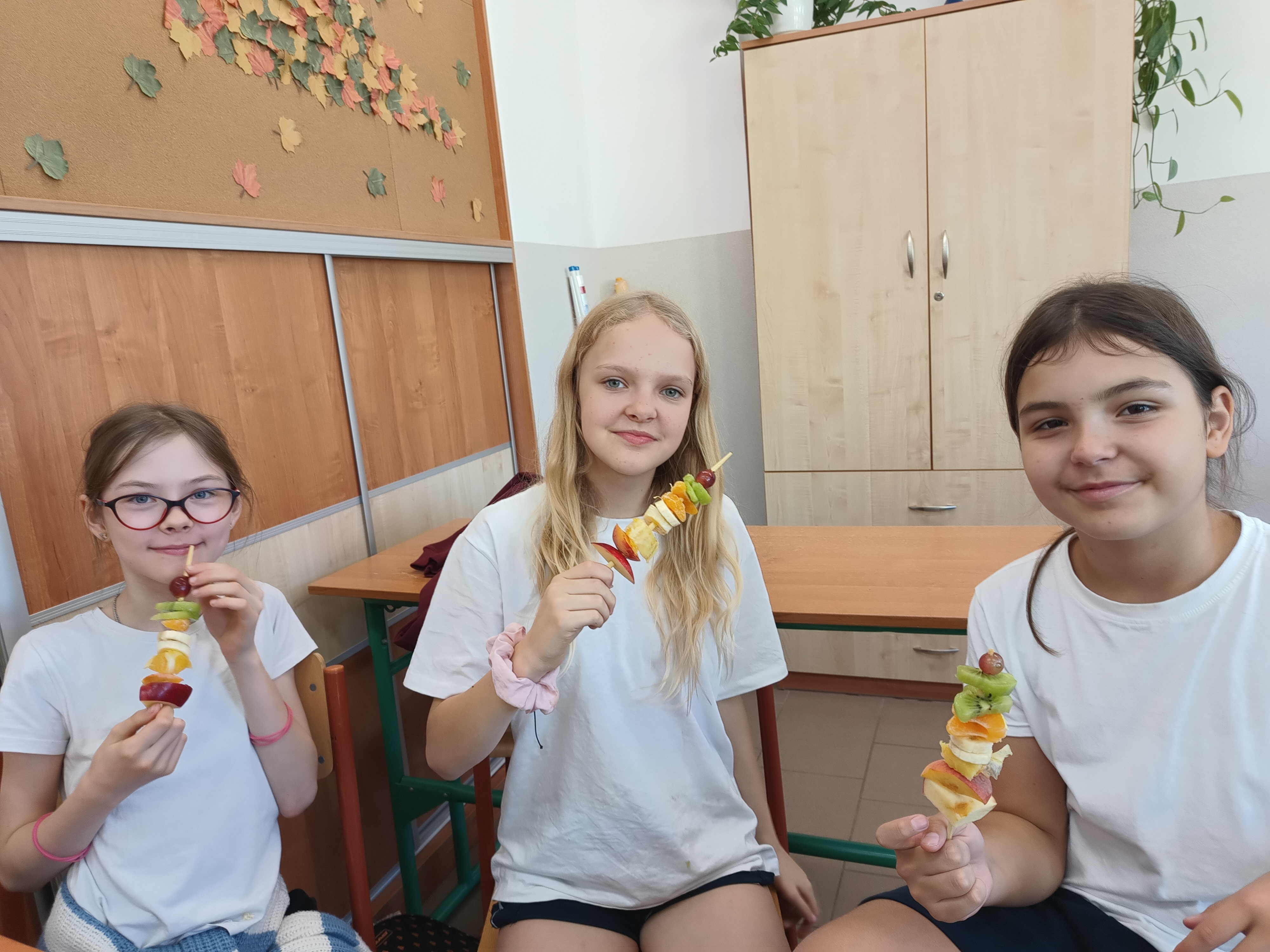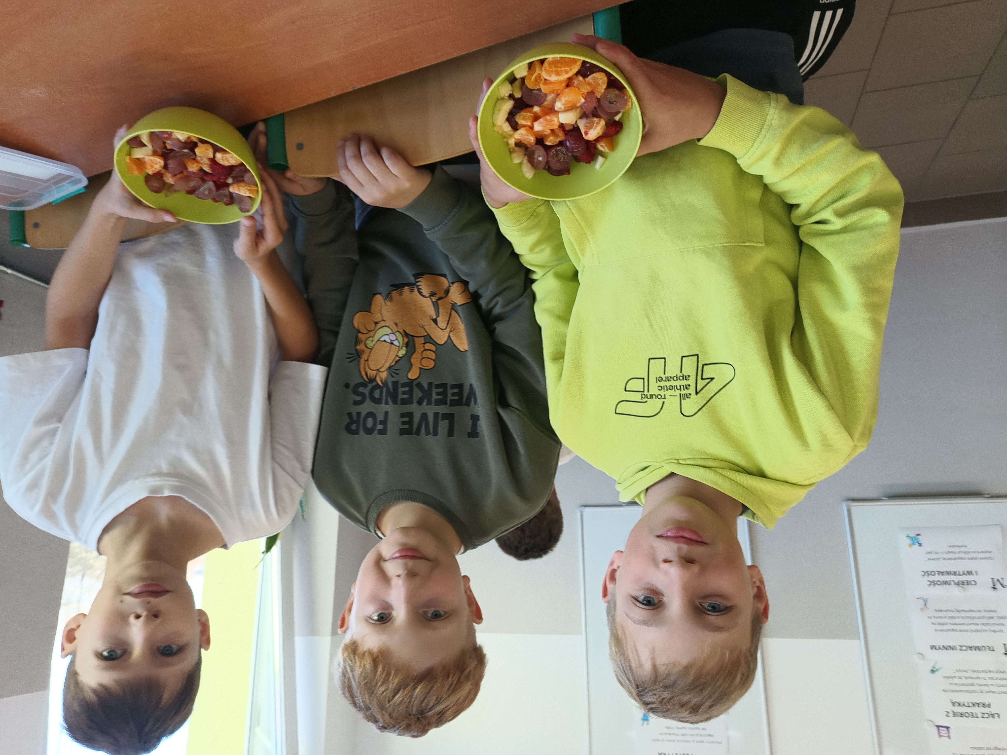 Uczniowie samodzielnie przygotowali zdrowe posiłki lub przekąski, te które dobrze im smakują. Natalia z Wiktorią przyrządziły sałatkę warzywną i kanapki. Lena, Maja i Zuzia owocowe szaszłyki. Mikołaj i Filip P. jaja z pomidorami w sosie czosnkowym, Jakub sałatkę owocową. Kuba B., z Wojtkiem i Andrzejem wykonali sałatkę owocową oraz zdrowe kanapeczki. Natomiast Filip, Ola, Eryk i Marek wykonali sałatkę owocową.